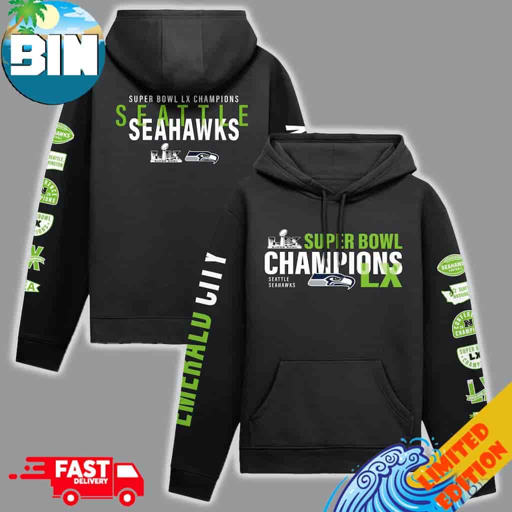 The 2025-26 Seattle Seahawks Fanatics Super Bowl LX Champions Four-Piece Hoodie is a premier commemorative apparel set designed for dedicated fans and collectors seeking a comprehensive way to celebrate the franchise’s second world title. This midweight collection, released following the team’s decisive 29-13 victory over the New England Patriots, serves as an ideal commemorative item or a high-value gift for supporters of the Pacific Northwest’s premier football organization. The hoodie features a structured pullover design crafted from a soft cotton and polyester blend, typically paired with a fleece lining to provide warmth in moderate temperatures. Its visual core is defined by the official Super Bowl LX champions branding, which incorporates the Seattle Seahawks’ signature college navy, action green, and wolf grey color scheme. High-quality screen-print graphics prominently display the Super Bowl LX logo alongside the iconic hawk head emblem and the Vince Lombardi Trophy, documenting the historic achievement of the 2025-2026 National Football League season.
