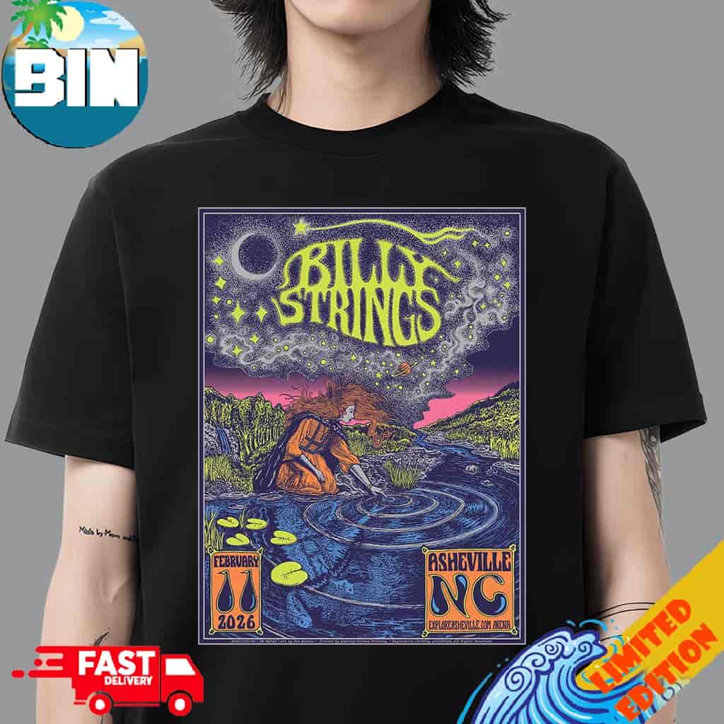 The Billy Strings Asheville Night 2 Poster On February 11 2026 At Harrah’s Cherokee Center Art By Fez Morend T-Shirt is a premium commemorative apparel item specifically designed for dedicated bluegrass fans, gig poster collectors, and enthusiasts of contemporary psychedelic-folk illustration. This 2026 edition garment serves as a functional and aesthetic record of the musician’s highly anticipated residency in North Carolina, making it a primary choice for those who attended the live event or for supporters seeking a high-value gifting option for fans of the Grammy-winning artist William Lee Apostol. The design features the sophisticated and intricate artistic signature of Fez Morend, an illustrator noted for his detailed, nature-centric, and often surrealist interpretations of musical themes. The visual core of the t-shirt showcases high-definition screen-printing that preserves the saturated color palette and complex linework characteristic of the original gig poster. Typically constructed from premium 100% ring-spun cotton or a soft cotton-polyester blend, this garment provides a comfortable, breathable, and durable fit suitable for daily wear, ensuring the artwork of the residency remains sharp and vibrant through regular laundering. Standard features such as double-needle stitching and a seamless collar enhance the structural integrity of the piece, reflecting the professional standards of modern tour merchandise. The historical and geographic context of this piece is centered on the Harrah’s Cherokee Center in Asheville, a historic cultural landmark nestled in the Blue Ridge Mountains of Western North Carolina. On February 11, 2026, the ExploreAsheville.com Arena hosted the second performance of the multi-night engagement, a run that further solidified the city’s reputation as a premier destination for roots-influenced and experimental acoustic music. Asheville is globally recognized as a vital hub for the international music community, and this performance represents a pivotal milestone in the 2025-2026 winter tour narrative. By documenting the specific Night 2 engagement, the t-shirt provides a factual record of the venue, city, and date, which are essential details for collectors documenting the evolution of modern jam band culture. From a utility perspective, this Billy Strings Asheville merchandise offers significant value as a versatile lifestyle staple that preserves the memory of the improvisational storytelling and technical precision exhibited during the winter residency. It functions as a tangible connection to the specific atmosphere and setlists of the North Carolina show, offering an enduring way to celebrate the synergy between the performer and the visionary illustrator. By naturally integrating keywords such as Fez Morend concert t-shirt, Harrah’s Cherokee Center music events, and 2026 bluegrass tour apparel, the description provides factual relevance for researchers and enthusiasts seeking verified tour memorabilia. This commemorative artwork remains a brand-safe and informative way to celebrate a historic night in the 2026 music calendar, preserving the legacy of the Asheville residency through high-quality material standards and precise event documentation.