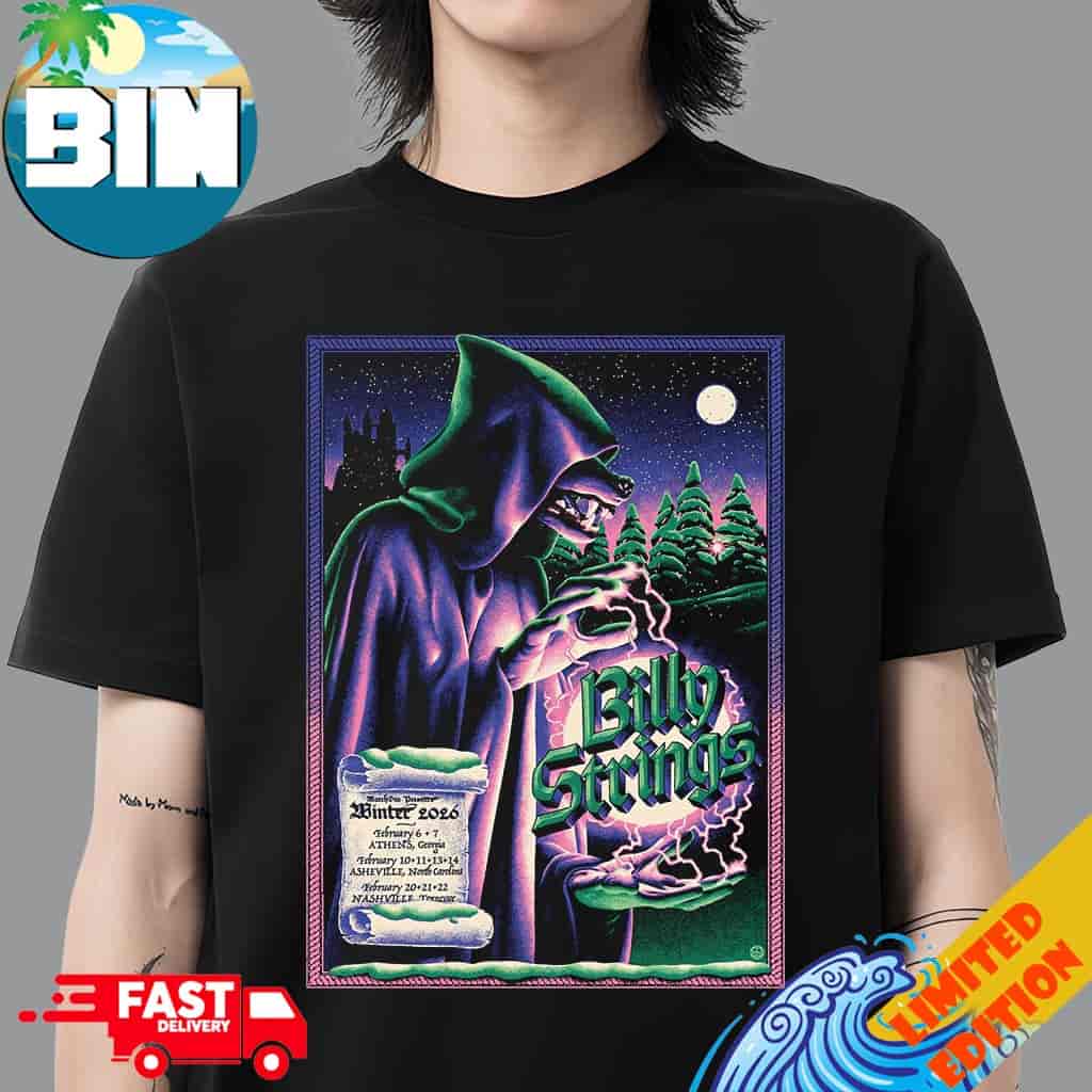 The Billy Strings Winter Tour February 2026 Art By Max Loeffler Unisex T-Shirt is an officially licensed piece of concert apparel designed for fans, music archivists, and collectors celebrating the artist’s extensive seasonal run. This high-quality garment features the exclusive tour artwork created by Max Loeffler, an illustrator renowned for his surrealist aesthetic and vintage-inspired textures that perfectly complement the experimental bluegrass sound of the Grammy Award-winning musician. The design prominently highlights the February 2026 tour dates, which include high-profile stops at venues such as the Akins Ford Arena in Athens, Georgia, and the ExploreAsheville.com Arena in North Carolina. Max Loeffler’s visual contributions for this tour cycle often utilize a sophisticated palette of muted earth tones and intricate, dreamlike silhouettes, reflecting the atmospheric and improvisational nature of a Billy Strings live performance. As a functional item of tour merchandise, the shirt is typically produced on a premium unisex chassis to ensure a comfortable fit for all attendees, serving as a wearable record of the 2026 winter circuit. This product is an ideal choice for gifting or personal acquisition, offering significant value as a keepsake from the sold-out shows that define this era of the artist’s career. By integrating verified geographic entities like Athens and Asheville into the broader tour context, the apparel provides a strong sense of place and time within the contemporary jam band scene. The print quality ensures that the fine details of the original poster art, from the stippled textures to the custom typography, remain sharp and durable through repeated wear. This t-shirt is more than just casual attire; it is a collectible item that captures the cultural synergy between the artist, the illustrator, and the historic music cities visited during the February residency. Whether worn at a future bluegrass festival or preserved as part of a curated collection, the Billy Strings Winter Tour 2026 shirt represents the professional standard of official artist merchandise. The seamless inclusion of Max Loeffler’s signature style alongside the specific temporal data of the tour ensures that this garment remains a definitive artifact of the artist’s musical journey through the American Southeast. Each shirt acts as a tangible connection to the vibrant community that follows Billy Strings, making it a staple for anyone looking to represent their support for modern acoustic music and visionary graphic art. This officially licensed item meets the high standards expected by the dedicated fan base, ensuring authenticity and artistic integrity in every thread.