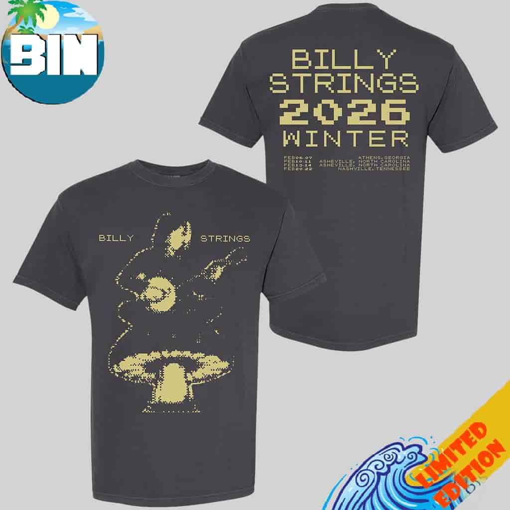 The Billy Strings Winter Tour February 2026 Billy Banjo Tee With Dates Connor Dwyer Two Sides T-Shirt is a premium piece of officially licensed commemorative apparel designed for fans, collectors, and those seeking a high-quality gift from the artist’s early 2026 performance circuit. This two-sided t-shirt serves as a functional archive of the winter tour, featuring original artwork by celebrated illustrator Connor Dwyer, whose unique “Billy Banjo” design has become a signature visual element of this specific tour leg. The garment is typically crafted from 100% cotton, such as the midweight Gildan 5000 or a similar heritage fabric, ensuring a soft feel and reliable durability for both daily wear and concert attendance. The front of the tee showcases the detailed “Billy Banjo” motif, while the reverse side meticulously documents the February itinerary, providing a wearable timeline of the band’s progression through major musical hubs in the American Southeast. Key geographical landmarks and venues listed on the apparel include the multi-night engagement at the Akins Ford Arena in Athens, Georgia, and the extensive sold-out residency at the Harrah’s Cherokee Center (ExploreAsheville.com Arena) in Asheville, North Carolina. The tour dates culminate in a prestigious Nashville finale, featuring high-profile shows at the Bridgestone Arena and the historic Ryman Auditorium. By integrating these specific venue names and city data, the shirt functions as a tangible memento of the virtuosic bluegrass performances delivered by Billy Strings alongside bandmates Billy Failing, Royal Masat, Jarrod Walker, and Alex Hargreaves. The tee holds significant value for art enthusiasts who follow the recurring collaborations between Strings and Connor Dwyer, as well as for those celebrating the release of the Grammy-winning album Highway Prayers. Beyond its status as a collector’s item, the shirt offers practical use as a breathable layer during indoor shows or as a casual staple for representing the modern bluegrass community. Incorporating natural search terms such as Billy Strings winter tour dates, February 2026 concert apparel, and Connor Dwyer artist series ensures that the product is appropriately contextualized within the landscape of authentic music industry releases. This commemorative t-shirt bridges the gap between the energy of live acoustic music and professional graphic design, providing a lasting and brand-safe tribute to one of the most significant winter tours in the artist’s career to date.