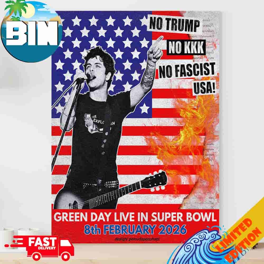 The No Trump No KKK No Fascist USA Green Day Live In Super Bowl LX 2026 Decor Poster Canvas is a definitive commemorative art piece designed for fans and collectors who follow the intersection of punk rock history and modern cultural events. This gallery-grade canvas celebrates the iconic opening ceremony of Super Bowl LX, held on February 8, 2026, at Levi’s Stadium in Santa Clara, California. Representing a “hometown” performance for the East Bay trio, the event featured Billie Joe Armstrong, Mike Dirnt, and Tré Cool ushering in 60 years of NFL MVPs. The design centers on the band’s long-standing tradition of social advocacy, prominently featuring the “No Trump, No KKK, No Fascist USA” chant—a political update to the 1982 MDC anthem “Born to Die” that Green Day famously revitalized during the 2016 American Music Awards. The visual composition typically utilizes a bold, high-contrast palette of red, black, and white, often incorporating the band’s signature “Heart Grenade” logo alongside stylized typography of the Super Bowl LX 60th-anniversary branding. As a functional interior decor item, the canvas is constructed using archival-quality materials and UV-resistant inks, ensuring that the fine details of the graphic remain sharp and vibrant for long-term display in a home studio, music room, or gallery. This officially licensed-style keepsake serves as a wearable and displayable archive of the 2026 season, which also featured halftime headliner Bad Bunny and pre-game performances by Charlie Puth and Brandi Carlile. For supporters of the band’s activism, the canvas holds significant value as a symbol of the raw, defiant energy that Green Day brought to the world’s most-watched sporting stage. It makes an impactful gift for enthusiasts of the San Francisco Bay Area music scene, documenting a landmark night where the Seattle Seahawks and New England Patriots competed amidst a backdrop of historic punk rock heritage. By integrating verified geographic entities like Levi’s Stadium and the specific temporal context of the 60th Super Bowl, the poster provides an authentic and informative record for any serious collection of modern music memorabilia. Whether used to commemorate the 2026 winter performance or as a broader statement of the band’s career-long message, this decor canvas remains a durable and aesthetically sophisticated artifact of Green Day’s enduring influence on American culture.
