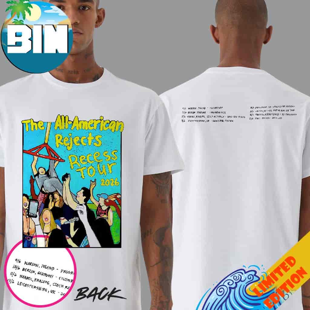 The All-American Rejects Recess Tour 2026 With Dates Two Sides Unisex T-Shirt is a premium piece of official concert merchandise designed for dedicated fans, longtime collectors, and music enthusiasts following the band’s highly anticipated return to the road. This commemorative garment marks the 2026 Recess Tour, a significant headline circuit that sees the multi-platinum power-pop and alternative rock quartet revisiting major North American markets. The t-shirt is primarily crafted from 100% pre-shrunk cotton, providing a soft, breathable, and durable fit that accommodates a wide range of body types with its versatile unisex silhouette. The design features a two-sided print that serves as a functional record of the tour’s itinerary. The front of the shirt prominently displays original artwork consistent with the Recess Tour’s visual branding, often incorporating the band’s signature logos and stylized typography that reflects their early 2000s heritage blended with contemporary aesthetics. On the reverse side, a comprehensive list of official 2026 tour dates and venues is displayed, documenting specific stops at prestigious locations such as the Kia Forum in Inglewood and various high-profile amphitheaters across the United States. High-fidelity screen printing techniques ensure that the vibrant inks and intricate details of the tour graphics remain sharp and resistant to fading or cracking over time. Beyond its use as casual apparel, this shirt functions as a significant piece of band memorabilia, making it an ideal gifting option for those who have supported the group through hits like Dirty Little Secret and Move Along. It allows attendees to physically preserve the memory of the live music experience and their participation in this specific era of the band’s career. The garment adheres to professional manufacturing standards, featuring a reinforced crew neck and double-stitched hems for longevity. As an officially licensed product, it represents an authentic link to the band’s creative output during the 2026 season. By anchoring the apparel in the factual context of the North American tour schedule, the shirt provides a brand-safe and informative way for supporters to showcase their loyalty. Whether worn to a future music festival or kept as a central item in a curated rock archive, this t-shirt ensures that the legacy of the Recess Tour is captured in a resilient and stylistically relevant format. This piece of All-American Rejects merchandise bridges the gap between traditional fan gear and historical documentation, offering a sophisticated way to celebrate the enduring impact of one of the most successful acts in the alternative rock genre.