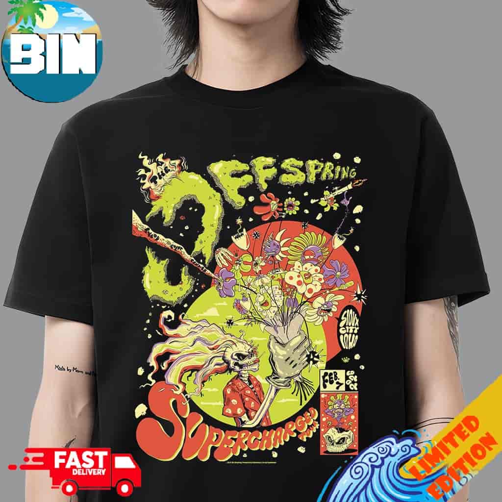 The Offspring Sioux City IA Supercharged Tour 2026 T-Shirt is a premium commemorative garment meticulously designed for dedicated punk rock enthusiasts, music memorabilia collectors, and fans of the legendary Southern California band. This 2026 edition apparel serves as a functional and factual record of the band’s high-energy performance in Sioux City, Iowa, which occurred as a prominent stop during the North American leg of their Supercharged World Tour. This global tour follows the successful release of their eleventh studio album, Supercharged, and celebrates over three decades of influential punk rock history. The t-shirt typically features a classic unisex fit, constructed from high-quality 100% ring-spun cotton or a soft cotton-polyester blend to provide a comfortable, breathable, and durable experience for daily wear, future music festivals, or commemorative display. The visual core of the design is centered on the official Supercharged branding, which frequently incorporates the band’s iconic flaming skull logo and bold, high-contrast typography in a professional color palette of industrial black, vibrant orange, and electric blue. High-definition screen-printing techniques ensure that the specific event details, including the venue name and performance date, remain sharp and resistant to fading through regular laundering.